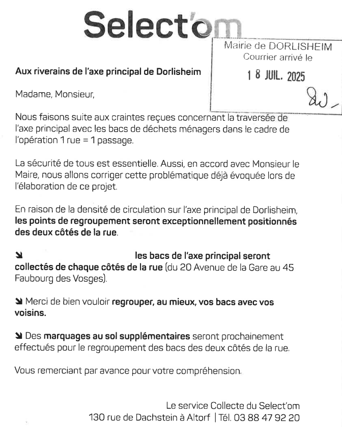 SELECT'OM : avis aux riverains de l'axe principal de DORLISHEIM, concernant les bacs à déchets